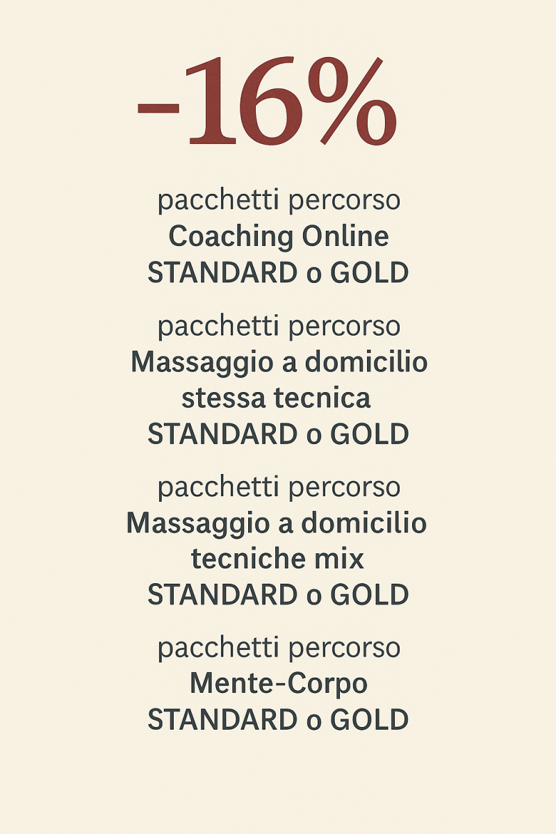 | 💻 Coaching Online (3 sessioni) | 30 min | 80,00 € (20,00 € cad.) | 60 min | 150,00 € (50,00 € cad.) |